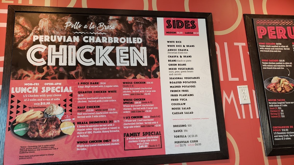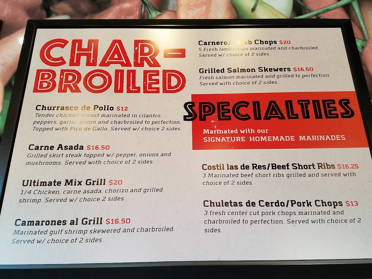 Choose 3 different meats:1/4 Brasa Chicken, Chicken Skewer, Beef Skewer, Shrimp Skewer, Center Cut Pork Chop, Carne Asada, Lamb Chop. Served with choice of 2 sides.